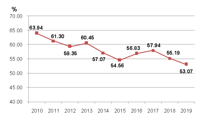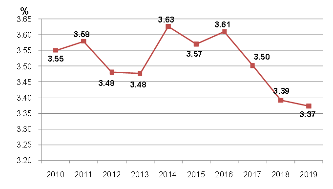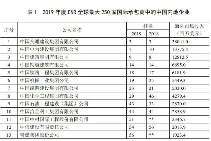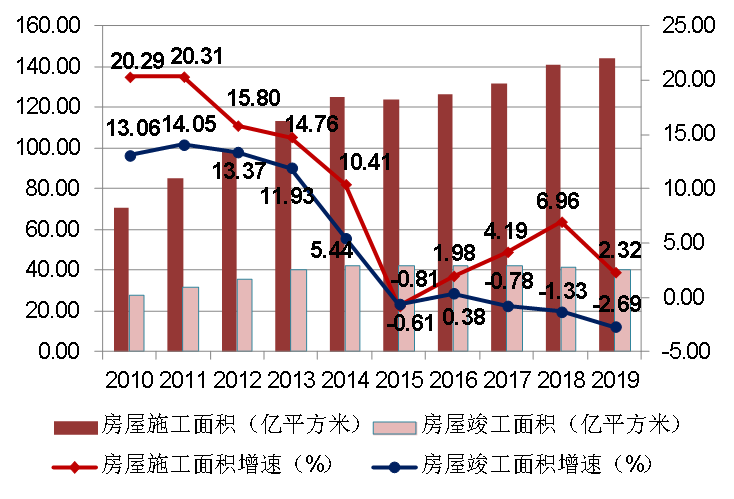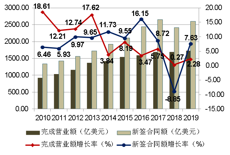自2010年以來,建筑業(yè)增加值占國內(nèi)生產(chǎn)總值的比例始終保持在6.6%以上。2019年達(dá)到了7.16%的近十年最高點(diǎn),在2015、2016年連續(xù)兩年下降后連續(xù)三年出現(xiàn)回升(圖2),建筑業(yè)國民經(jīng)濟(jì)支柱產(chǎn)業(yè)的地位穩(wěn)固。 圖2  2010-2019年建筑業(yè)增加值占國內(nèi)生產(chǎn)總值比重 (二)建筑業(yè)總產(chǎn)值持續(xù)增長  增速連續(xù)兩年下降 近年來,隨著我國建筑業(yè)企業(yè)生產(chǎn)和經(jīng)營規(guī)模的不斷擴(kuò)大,建筑業(yè)總產(chǎn)值持續(xù)增長,2019年達(dá)到248445.77億元,比上年增長5.68%。但建筑業(yè)總產(chǎn)值增速比上年降低了4.20個(gè)百分點(diǎn),連續(xù)兩年下降。(圖3)。 (三)建筑業(yè)從業(yè)人數(shù)減少但企業(yè)數(shù)量增加  勞動(dòng)生產(chǎn)率再創(chuàng)新高 2019年底,全社會(huì)就業(yè)人員總數(shù)77471萬人,其中,建筑業(yè)從業(yè)人數(shù)5427.37萬人,比上年末減少135.93萬人,減少2.44%。建筑業(yè)從業(yè)人數(shù)占全社會(huì)就業(yè)人員總數(shù)的7.01%,比上年降低0. 16個(gè)百分點(diǎn)(圖4)。建筑業(yè)在吸納農(nóng)村轉(zhuǎn)移人口就業(yè)、推進(jìn)新型城鎮(zhèn)化建設(shè)和維護(hù)社會(huì)穩(wěn)定等方面繼續(xù)發(fā)揮顯著作用。 截至2019年底,全國共有建筑業(yè)企業(yè)103814個(gè),比上年增加8414個(gè),增速為8.82%,比上年增加了0.50個(gè)百分點(diǎn),增速連續(xù)四年增加并達(dá)到近十年來最高點(diǎn)(圖5)。國有及國有控股建筑業(yè)企業(yè)6927個(gè),比上年增加47個(gè),占建筑業(yè)企業(yè)總數(shù)的6.67%,比上年下降了0.54個(gè)百分點(diǎn)。 2019年,按建筑業(yè)總產(chǎn)值計(jì)算的勞動(dòng)生產(chǎn)率為399656元/人,比上年增長7.09%,增速比上年降低0.31個(gè)百分點(diǎn),勞動(dòng)生產(chǎn)率水平再創(chuàng)新高(圖6)。 圖6  2010-2019按建筑業(yè)總產(chǎn)值計(jì)算的建筑業(yè)勞動(dòng)生產(chǎn)率及增速 (四)建筑業(yè)企業(yè)利潤總量持續(xù)增長  行業(yè)產(chǎn)值利潤率略有下降 2019年,全國建筑業(yè)企業(yè)實(shí)現(xiàn)利潤8381億元,比上年增加406.18億元,增速為5.09%,增速比上年降低1.36個(gè)百分點(diǎn)(圖7)。 圖7  2010-2019年全國建筑業(yè)企業(yè)利潤總額及增速 近10年來,建筑業(yè)產(chǎn)值利潤率(利潤總額與總產(chǎn)值之比)一直在3.5%上下徘徊。2019年,建筑業(yè)產(chǎn)值利潤率為3.37%,比上年降低了0.02個(gè)百分點(diǎn),連續(xù)三年下降(圖8)。 圖8  2010-2019年建筑業(yè)產(chǎn)值利潤率 (五)建筑業(yè)企業(yè)簽訂合同總額、新簽合同額總量增長  增速放緩 2019年,全國建筑業(yè)企業(yè)簽訂合同總額545038.89億元,比上年增長10.24%,增速比上年下降2.25個(gè)百分點(diǎn)。其中,本年新簽合同額289234.99億元,比上年增長了6.00%,增速比上年下降1.14個(gè)百分點(diǎn)(圖9)。本年新簽合同額占簽訂合同總額比例為53.07%,比上年降低了2.12個(gè)百分點(diǎn),連續(xù)兩年下降(圖10)。 圖9 2010-2019年全國建筑業(yè)企業(yè)簽訂合同總額、新簽合同額及增速 圖10 2010-2019年全國建筑業(yè)企業(yè)新簽合同額占合同總額比例 (六)建筑業(yè)企業(yè)房屋施工面積增長、竣工面積下降  住宅竣工面積占房屋竣工面積近七成 2019年,全國建筑業(yè)企業(yè)房屋施工面積144.16億平方米,比上年增長2.32%,增速下降4.64個(gè)百分點(diǎn)??⒐っ娣e40.24億平方米,比上年下降2.69%,連續(xù)三年負(fù)增長(圖11)。 圖11  2010-2019年建筑業(yè)企業(yè)房屋施工面積、竣工面積及增速 從全國建筑業(yè)企業(yè)房屋竣工面積構(gòu)成情況看,住宅竣工面積占最大比重,為67.35%;廠房及建筑物竣工面積占12.20%;商業(yè)及服務(wù)用房竣工面積占7.11%;其他種類房屋竣工面積占比均在5%以下(圖12)。 圖12  2019年全國建筑業(yè)企業(yè)房屋竣工面積構(gòu)成 在城鎮(zhèn)保障性安居工程方面,2019年,全國各類棚戶區(qū)改造開工316萬套,基本建成254萬套。全國農(nóng)村地區(qū)建檔立卡貧困戶危房改造63.8萬戶。 (七)對(duì)外承包工程完成營業(yè)額和新簽合同額總量、增速雙雙增長 2019年,我國對(duì)外承包工程業(yè)務(wù)完成營業(yè)額1729億美元,比上年增長2.28%,增速比上年提高2.01個(gè)百分點(diǎn)。新簽合同額2602.5億美元,比上年增長7.63%,增速比上年增加了16.48個(gè)百分點(diǎn)(圖13)。  圖13 2010-2019年我國對(duì)外承包工程業(yè)務(wù)情況 2019年,我國對(duì)外勞務(wù)合作派出各類勞務(wù)人員48.7萬人,較上年同期減少0.5萬人;其中承包工程項(xiàng)下派出21.1萬人,勞務(wù)合作項(xiàng)下派出27.6萬人。12月末在外各類勞務(wù)人員99.2萬人,較上年同期減少0.4萬人。      美國《工程新聞?dòng)涗洝罚ê喎Q“ENR”)雜志公布的2019年度全球最大250家國際承包商共實(shí)現(xiàn)海外市場營業(yè)收入4873億美元,比上一年度增長了1.0%。我國內(nèi)地共有76家企業(yè)入選2019年度全球最大250家國際承包商榜單,入選數(shù)量比上一年度增加了7家。入選企業(yè)共實(shí)現(xiàn)海外市場營業(yè)收入1190億美元,比上年增長了4.3%,占250家國際承包商海外市場營業(yè)收入總額的24.4 %,比上年提高0.7個(gè)百分點(diǎn)。      從進(jìn)入榜單企業(yè)的排名分布來看,76